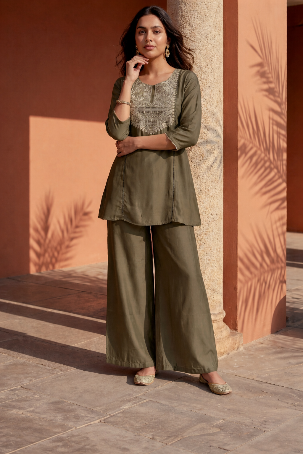 The olive green tunic features intricate embroidery on the neckline, adding a graceful charm, while the flowy wide-leg pants create a flattering silhouette that moves beautifully with you. Perfect for festive gatherings, office wear, brunch dates, or intimate celebrations — this set is your go-to statement outfit.