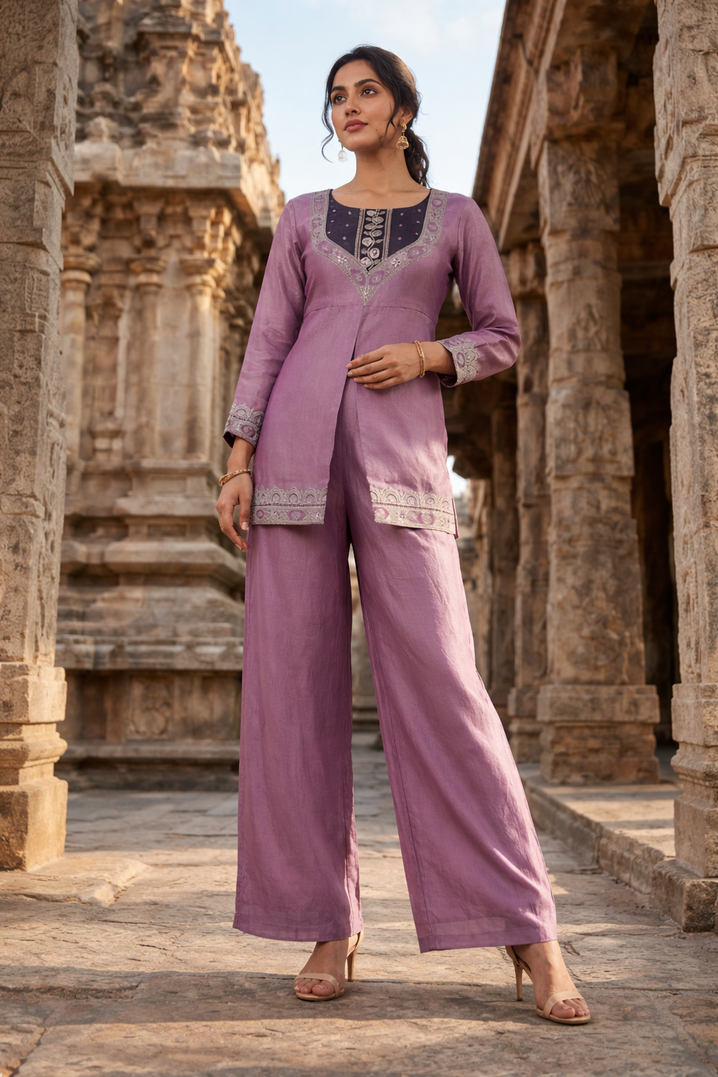 The kurta features intricate embroidery detailing on the neckline and sleeve borders, adding a refined traditional touch. Paired with wide-leg pants, this co-ord set creates a flattering, elegant look perfect for festive gatherings, family functions, cultural events, and special occasions.