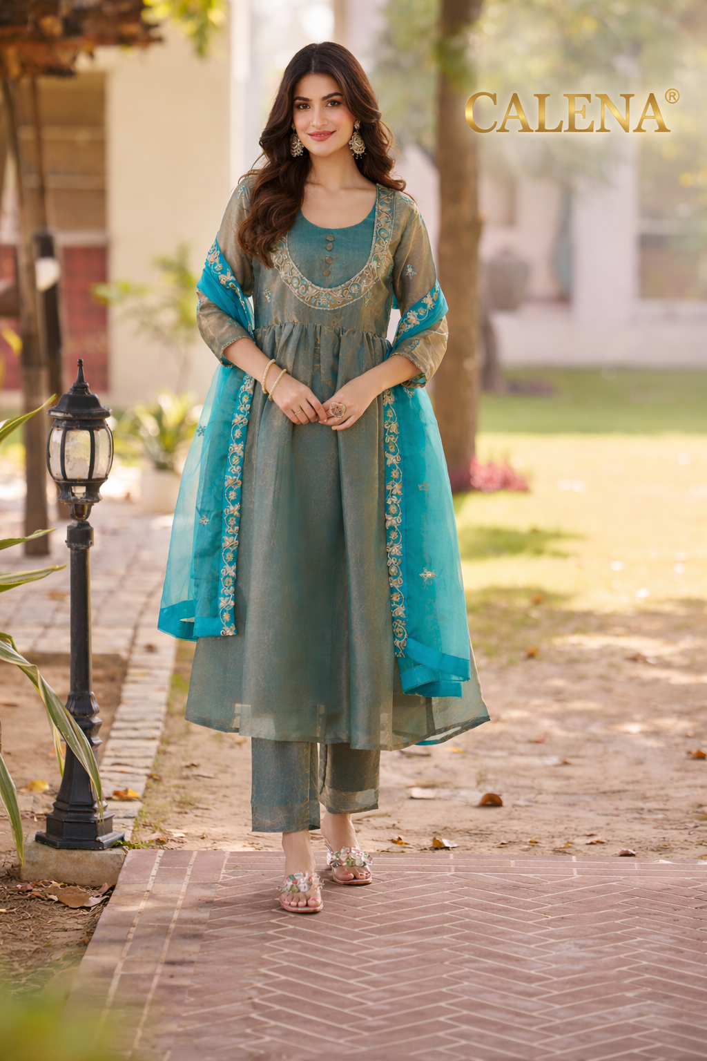 + Free ShippingElevate your ethnic wardrobe with this graceful teal blue ensemble from CALENA, designed for timeless elegance and festive charm. Crafted from premium Fendi Satin, this outfit features a beautifully flared kurta adorned with intricate embroidery along the neckline and borders, creating a rich and sophisticated look. The sheer organza dupatta with detailed embellishments adds a touch of lightness and refinement, while the coordinated straight pants ensure comfort with style.