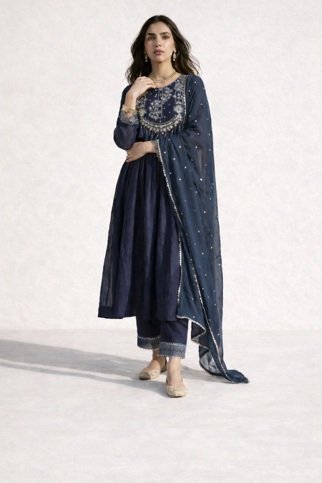 • Kurta: Embroidered neckline with elegant flare